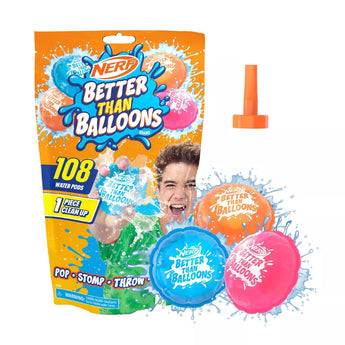 Nerf Better Than Balloons brand is the water balloon alternative for a revolution in water play! There are so many ways to play with these colorful water pods! Pop them, stomp them, throw them, and splash them! Make up all kinds of games with these versatile water pods that are fun for everyone. Nerf Better Than Balloons self-sealing pods stay in 1 piece when they burst, so when the play is over, picking them up is quick and easy. No more searching for lots of small pieces, which makes cleaning up after water balloon games such a chore. The water pods come attached together on a sheet and are easy to remove. The individual sheets let you choose how many you want to use. Fill a few sheets to enjoy multiple games, or fill them all for one big burst of fun! The design and material make them reliable when filling up, for less unintended breakage. Includes a total of 108 pods on 9 sheets and a reusable nozzle.